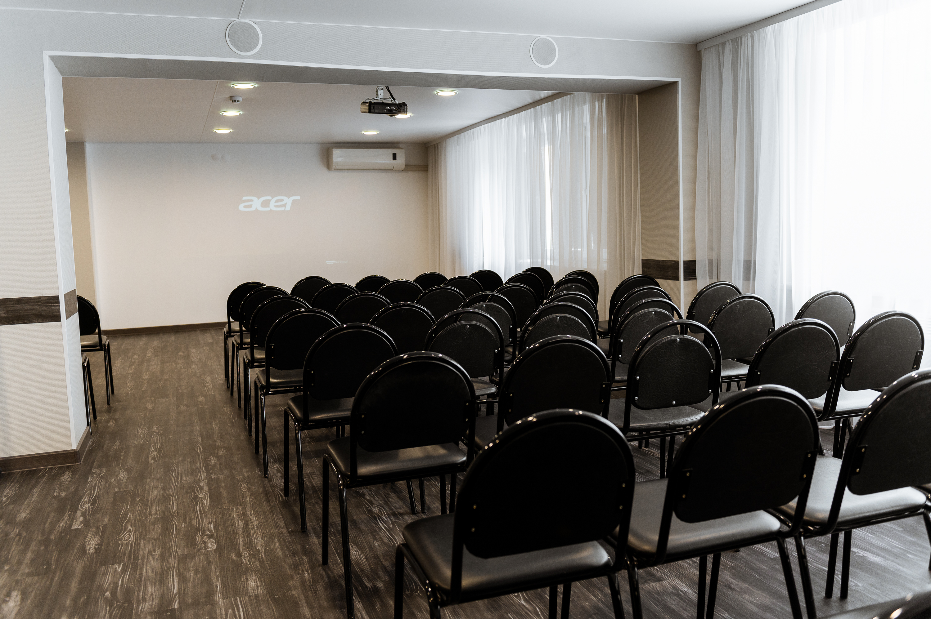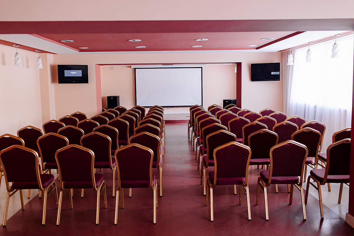 Просторный и светлый конференц-зал, оформленный в деловом стиле, рассчитанный на 60 человек. Возможна вариативная расстановка столов. Доступное оборудование: мультимедийный проектор, экран, система звукоусиления, беспроводной WiFi позволяет проводить видеоконференции. Зал оснащен системой кондиционирования воздуха.