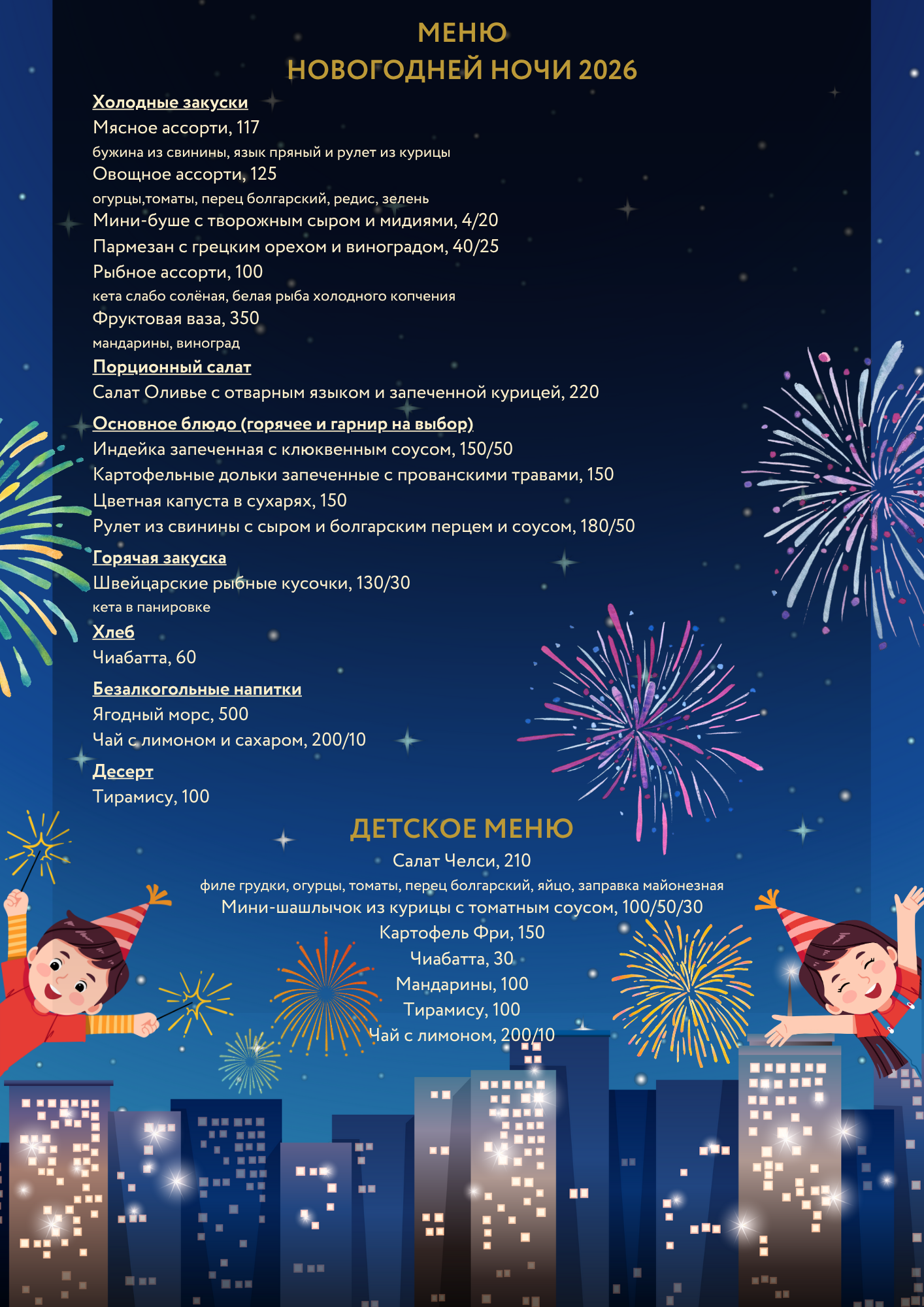 Самая волшебная ночь года под сиянием городских огней в ресторане «Terrassa». Уютный интерьер, праздничное банкетное меню от шеф-повара, новогодняя программа и многое другое ждёт вас 31 декабря в гостинице АМАКС «Юбилейная»